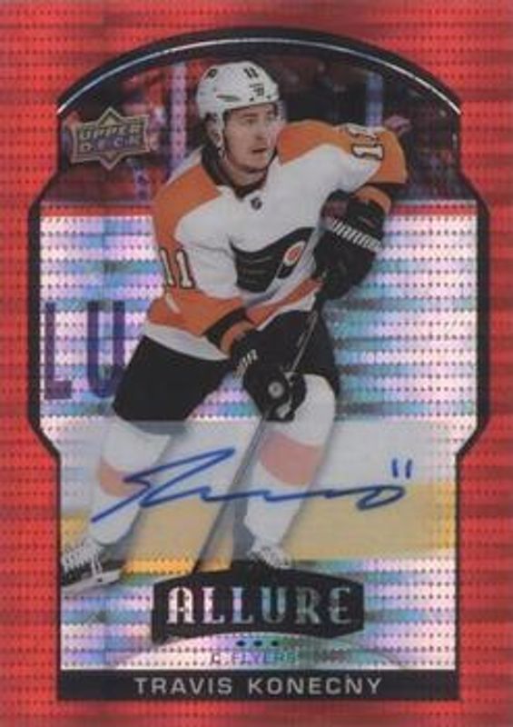 The Travis Konecny 2020 Upper Deck Allure #20 Red Rainbow Autographs /299 card is 1 of 38 Travis Konecny's card variations in the 2020 Upper Deck Allure set being tracked by Sports Card Investor, including Base, 2005 Shield, Black Rainbow, Blue China, and Leopard.