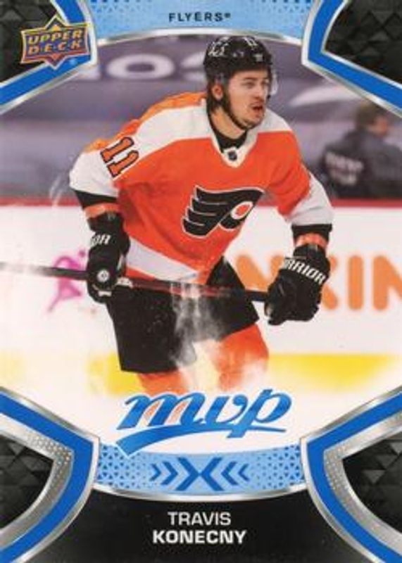 The Travis Konecny 2021 Upper Deck MVP #69 Blue card is 1 of 28 Travis Konecny's card variations in the 2021 Upper Deck MVP set being tracked by Sports Card Investor, including Base, Gold Script, Ice Battles, Silver Script, and Super Script /25.