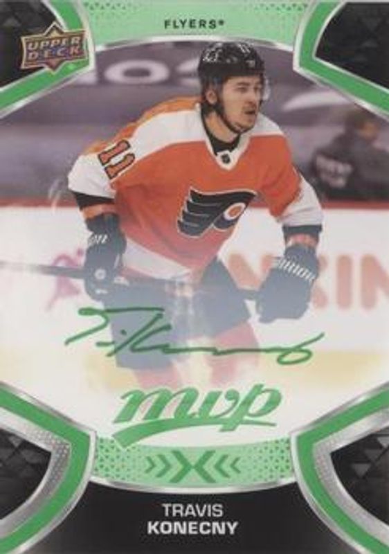 The Travis Konecny 2021 Upper Deck MVP #69 Green Script card is 1 of 28 Travis Konecny's card variations in the 2021 Upper Deck MVP set being tracked by Sports Card Investor, including Base, Blue, Gold Script, Ice Battles, and Silver Script.