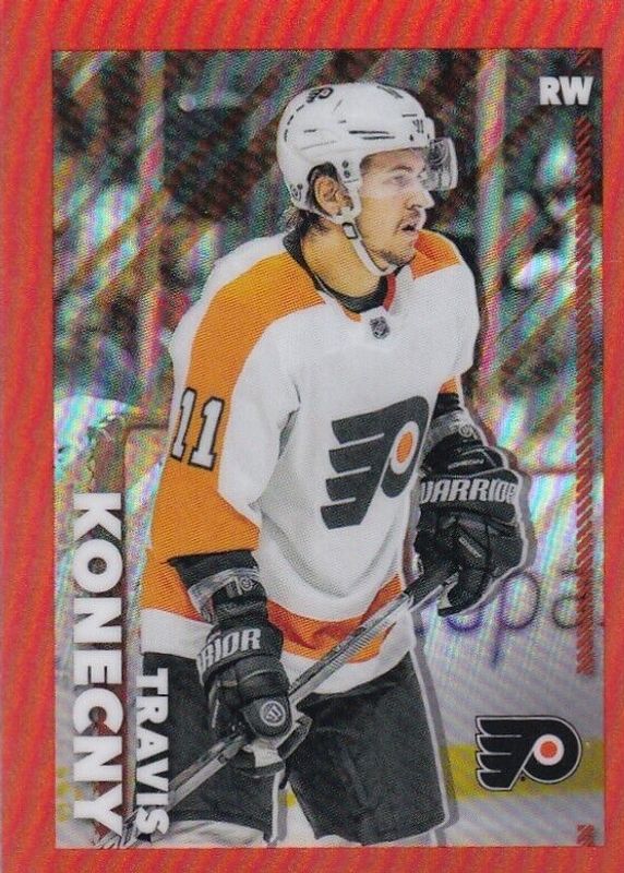 This card is 1 of 6 Travis Konecny's card variations in the 2022 Topps Chrome NHL Sticker Collection set being tracked by Sports Card Investor, including Base, Refractor /99, Gold Refractor /50, Red Refractor /5, and Superfractor /1.