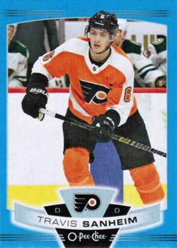 The Travis Sanheim 2019 O-Pee-Chee #96 Blue Border card is 1 of 8 Travis Sanheim's card variations in the 2019 O-Pee-Chee set being tracked by Sports Card Investor, including Base, Gold Border, Red Border, Red Border Blank Back, and Retro.