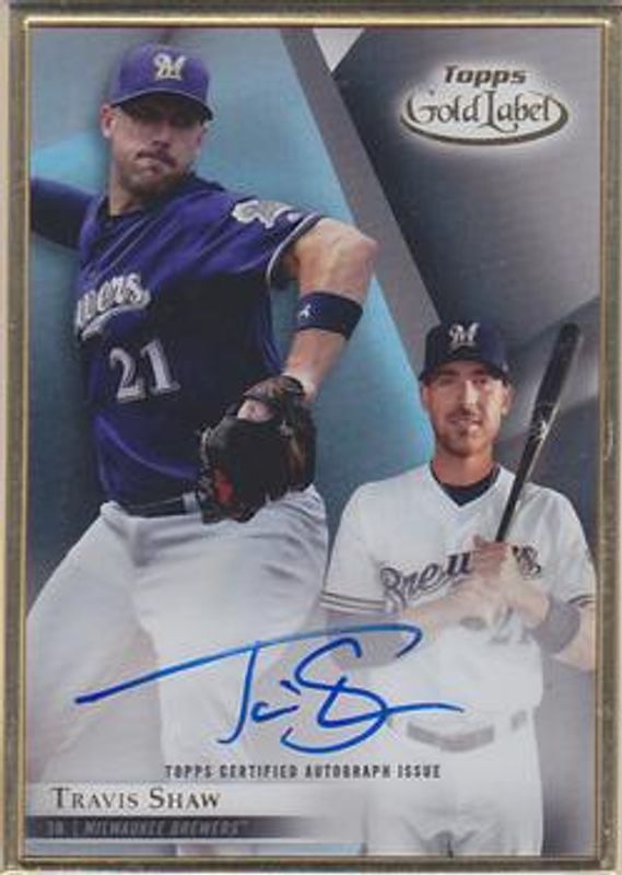 The Travis Shaw 2018 Topps Gold Label #FA-ST Framed Autographs /75 card is 1 of 5 Travis Shaw's card variations in the 2018 Topps Gold Label set being tracked by Sports Card Investor, including Framed Autographs - Black /75, Framed Autographs - Blue /50, Framed Autographs - Red /25, and Framed Autographs - Gold /1.