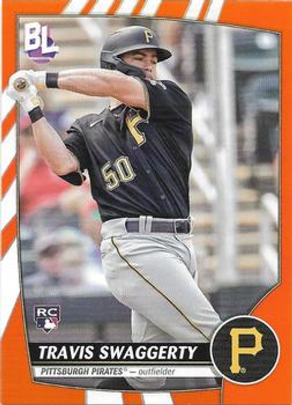The Travis Swaggerty 2023 Topps Big League #14 Electric Orange Rookie card is 1 of 7 Travis Swaggerty's card variations in the 2023 Topps Big League set being tracked by Sports Card Investor, including Base, Red Foil, Black Foil /25, FoilFractor /1, and Electric Orange Base Autographs.