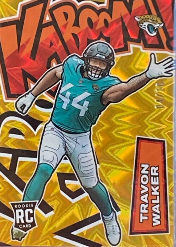 The Travon Walker 2022 Absolute #K44 Kaboom! (Vertical) - Gold /10 Rookie card in Raw condition has not changed in price in the last 30 days and was last sold for $714.44 .
