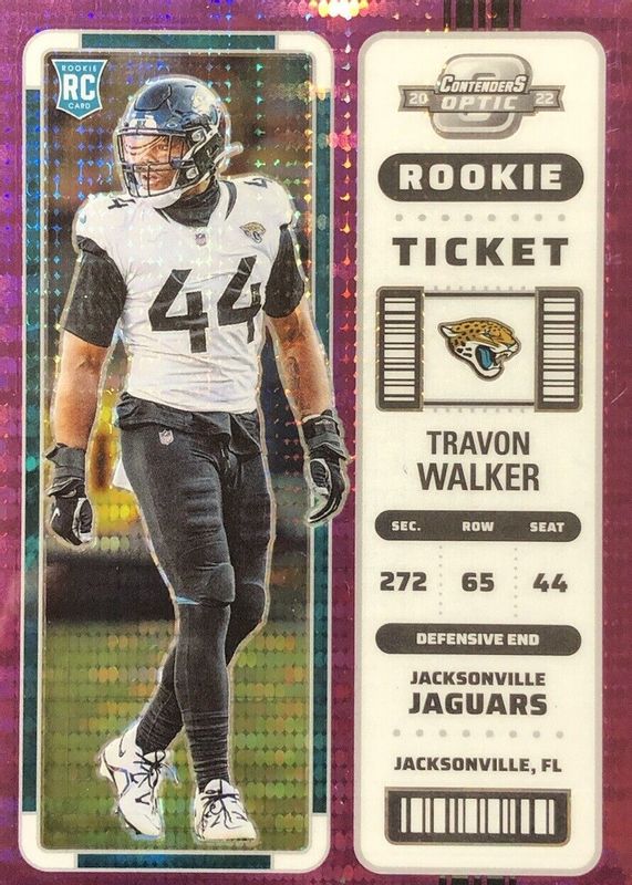 The Travon Walker 2022 Contenders Optic #92 Purple Pulsar /26 Rookie card in Raw condition has not changed in price in the last 30 days and was last sold for $13.00 .