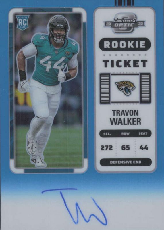 The Travon Walker 2022 Contenders Optic #135 Rookie Ticket Auto - Teal /99 card in Raw condition has not changed in price in the last 30 days and was last sold for $10.50 .