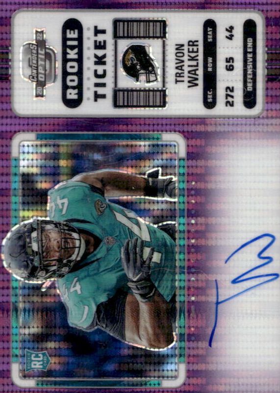 The Travon Walker 2022 Contenders Optic #135 Rookie Ticket Auto Variation - Purple Pulsar /21 card in Raw condition has not changed in price in the last 30 days and was last sold for $42.00 .
