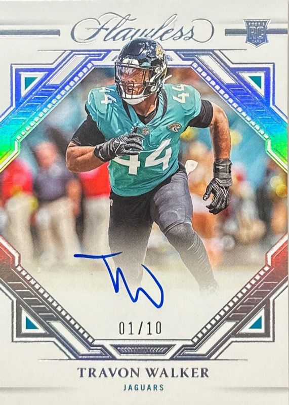 The Travon Walker 2022 Flawless #RFS-TW Rookie Frame Signatures - Silver (/10) card in Raw condition has not changed in price in the last 30 days and was last sold for $50.00 .
