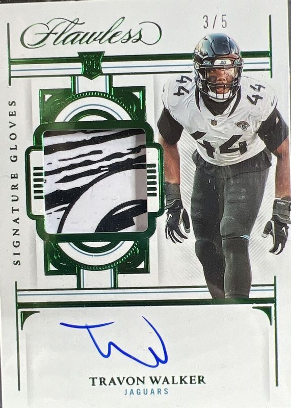 The Travon Walker 2022 Flawless #SG-TW Signature Gloves - Emerald /5 Rookie card in Raw condition has not changed in price in the last 30 days and was last sold for $24.98 .