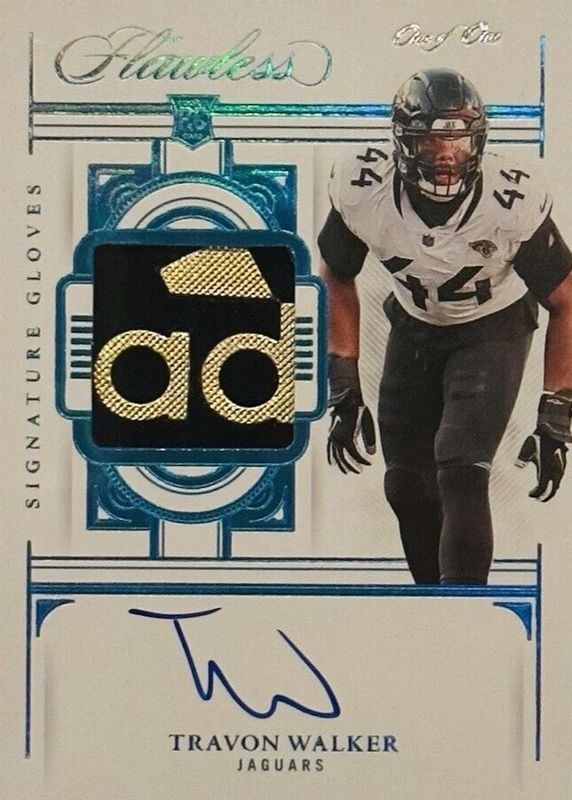 The Travon Walker 2022 Flawless #SG-TW Signature Gloves - Platinum /1 Rookie card in Raw condition has not changed in price in the last 30 days and was last sold for $290.00 .