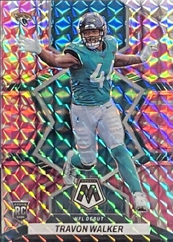 The Travon Walker 2022 Mosaic #286 NFL Debut - Pink Swirl /11 Rookie card in Raw condition has not changed in price in the last 30 days and was last sold for $15.50 .