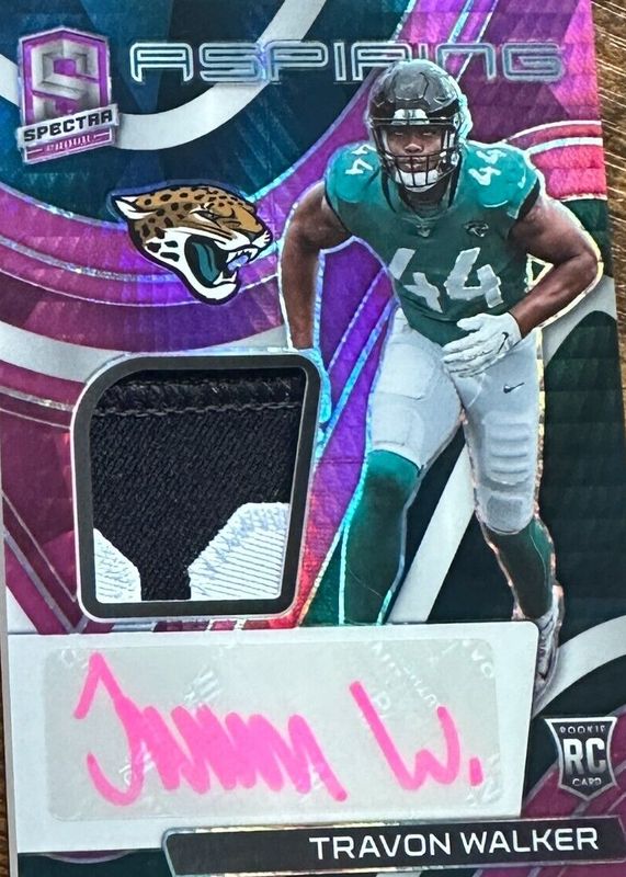 The Travon Walker 2022 Spectra #APA-TWA Aspiring Patch Autographs - Neon Pink /25 Rookie card in Raw condition has not changed in price in the last 30 days and was last sold for $10.51 .