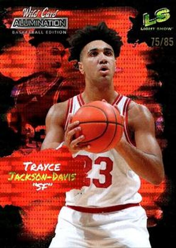 The Trayce Jackson-Davis 2021 Wild Card Alumination #LS-21 Light Show Red Chase Red Holo Lux /85 card is 1 of 525 Trayce Jackson-Davis' card variations in the 2021 Wild Card Alumination set being tracked by Sports Card Investor, including Base, 100 Stripe, 10 Stripe, 20 Stripe, and 50 Stripe.