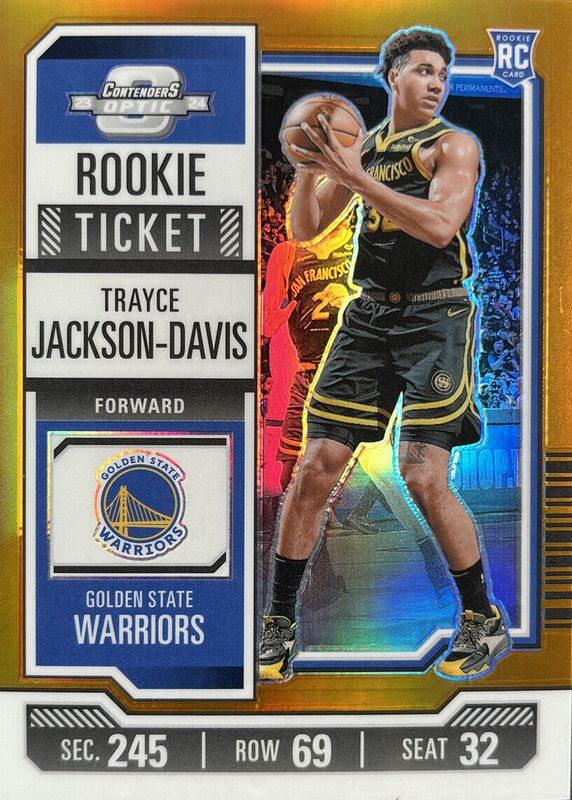 The Trayce Jackson-Davis 2023 Contenders Optic #14 Rookie Ticket - Orange /49 card in Raw condition has not changed in price in the last 30 days and was last sold for $3.25 .