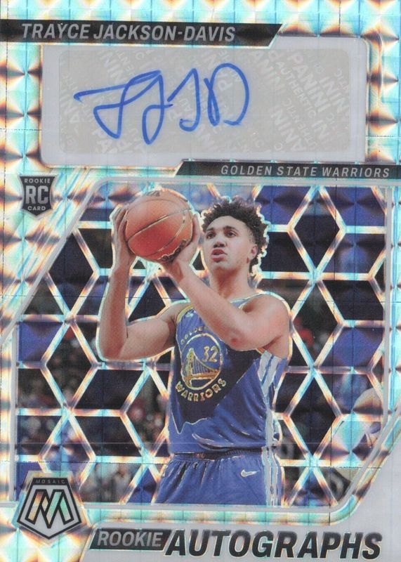 The Trayce Jackson-Davis 2023 Mosaic #RA-TJD Rookie Autographs - Mosaic card in Raw condition has not changed in price in the last 30 days and was last sold for $15.50 .