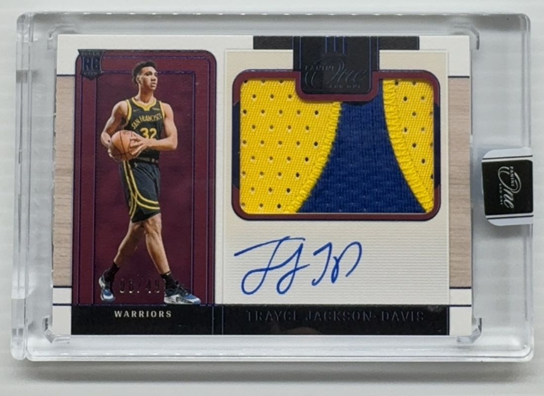 The Trayce Jackson-Davis 2023 One and One #9 Precision Rookie Jersey Autographs - Blue /49 card is 1 of 16 Trayce Jackson-Davis' card variations in the 2023 One and One set being tracked by Sports Card Investor, including Base /99, Blue /35, Purple /25, Red /15, and Gold /10.