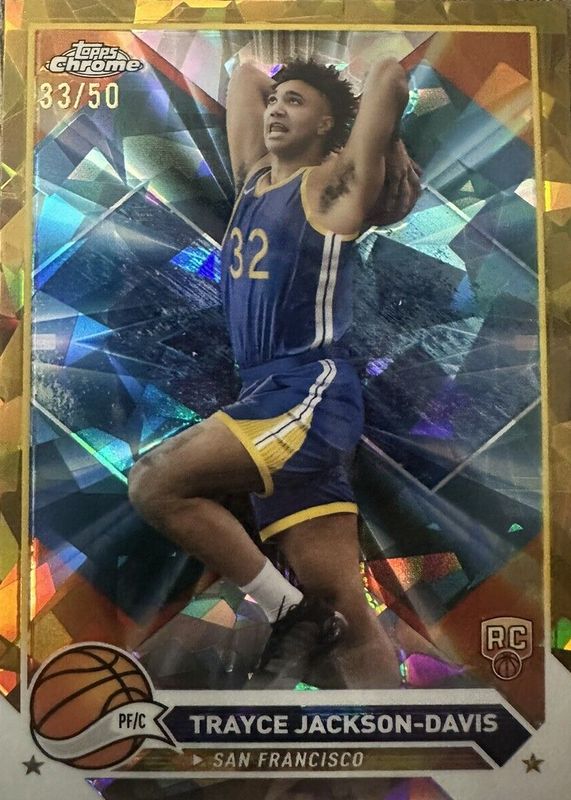 The Trayce Jackson-Davis 2023 Topps Chrome Sapphire Edition #176 Gold /50 Rookie card in Raw condition has not changed in price in the last 30 days and was last sold for $6.25 .
