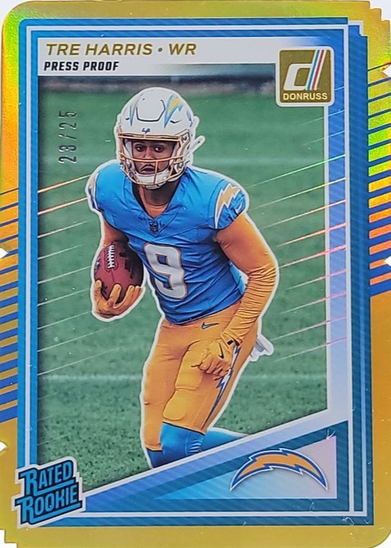 The Tre Harris 2025 Donruss #329 Press Proof Gold Die-Cut /25 Rookie card in Raw condition has not changed in price in the last 30 days and was last sold for $12.00 .