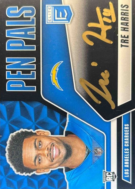 The Tre Harris 2025 Elite #PP-THA Pen Pals - Black Gold Ink Rookie card in Raw condition has not changed in price in the last 30 days and was last sold for $31.00 .