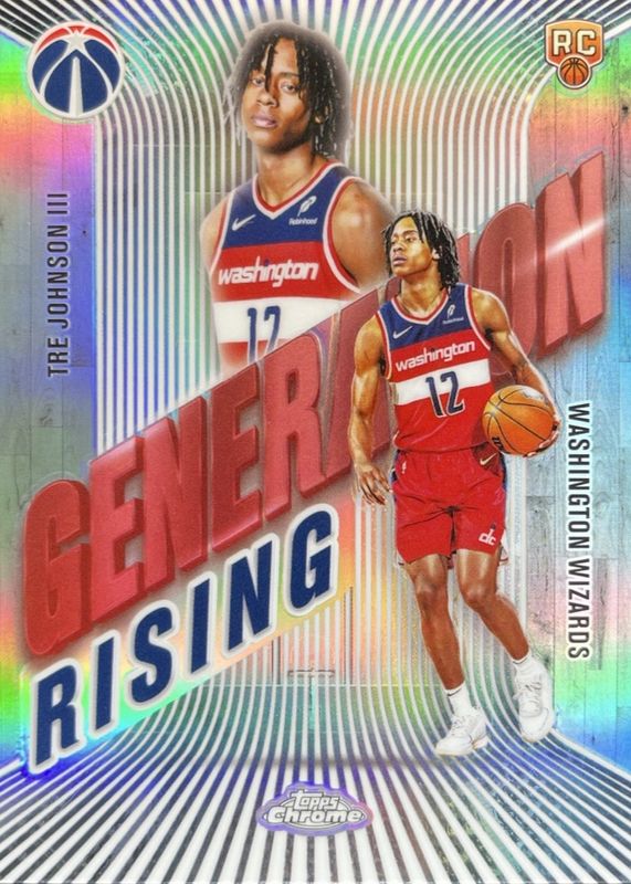 The Tre Johnson III 2025 Topps Chrome #GR-6 Generation Rising - Refractor Rookie card in Raw condition has moved down -$7.50 (-83.3%) in the last 30 days and was last sold for $1.50 .