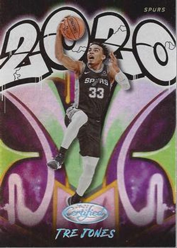 The Tre Jones 2020 Certified #3 2020 Graffiti Rookie card is 1 of 34 Tre Jones' card variations in the 2020 Certified set being tracked by Sports Card Investor, including Base, Asia Exclusive, Asia Exclusive Gold, Asia Exclusive Red, and Mirror Blue.