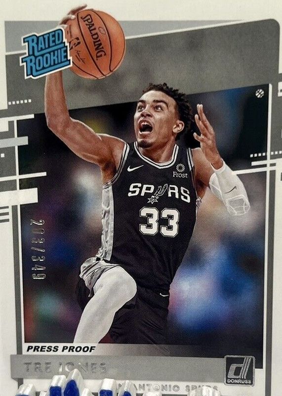 The Tre Jones 2020 Donruss #244 Press Proof Silver /349 Rookie card in Raw condition has not changed in price in the last 30 days and was last sold for $0.99 .