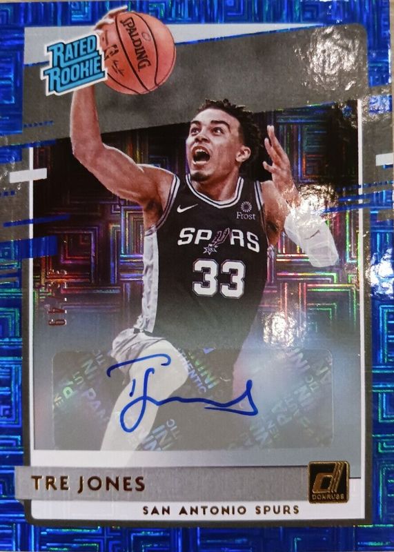 The Tre Jones 2020 Donruss #244 Rated Rookie Signatures - Choice Blue /49 card in Raw condition has not changed in price in the last 30 days and was last sold for $7.00 .