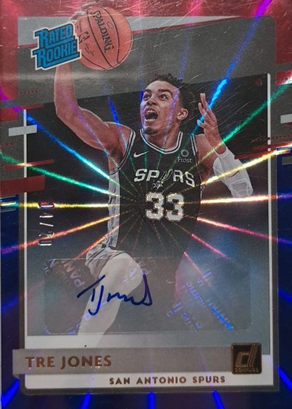 The Tre Jones 2020 Donruss #244 Rated Rookie Signatures - Holo Red & Blue Laser /20 card in Raw condition has not changed in price in the last 30 days and was last sold for $19.99 .
