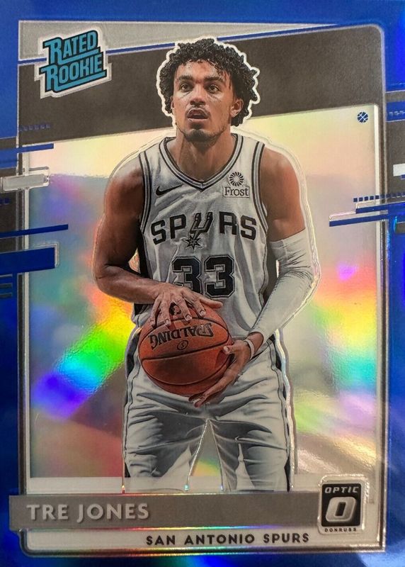 The Tre Jones 2020 Optic #188 Blue /59 Rookie card in Raw condition has not changed in price in the last 30 days and was last sold for $9.50 .