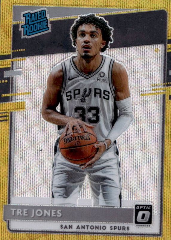 The Tre Jones 2020 Optic #188 Gold Wave Rookie card in Raw condition has not changed in price in the last 30 days and was last sold for $1.25 .