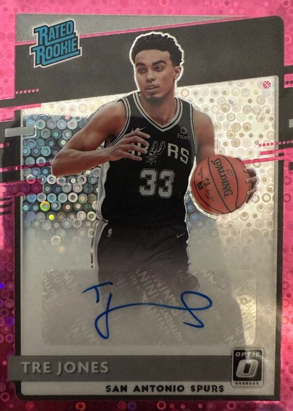 The Tre Jones 2020 Optic #188 Rated Rookie Signatures - Fast Break Pink /20 card in Raw condition has not changed in price in the last 30 days and was last sold for $29.76 .