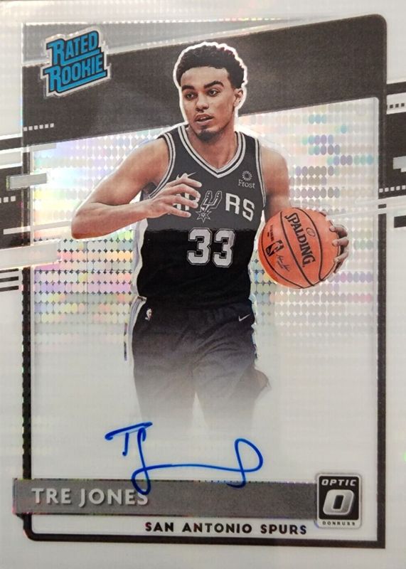 The Tre Jones 2020 Optic #188 Rated Rookie Signatures - Pulsar /19 card in Raw condition has not changed in price in the last 30 days and was last sold for $5.50 .