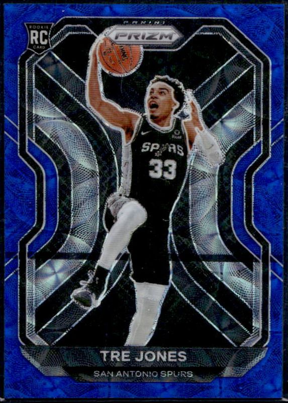 The Tre Jones 2020 Prizm #291 Choice Blue /49 Rookie card is 1 of 69 Tre Jones' card variations in the 2020 Prizm set being tracked by Sports Card Investor, including Choice Blue Yellow Green, Fast Break, Green, Green Ice, and Hyper.