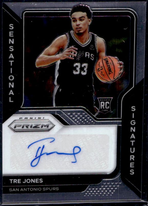 The Tre Jones 2020 Prizm #SS-TJN Sensational Signatures Rookie card is 1 of 69 Tre Jones' card variations in the 2020 Prizm set being tracked by Sports Card Investor, including Choice Blue Yellow Green, Fast Break, Green, Green Ice, and Hyper.