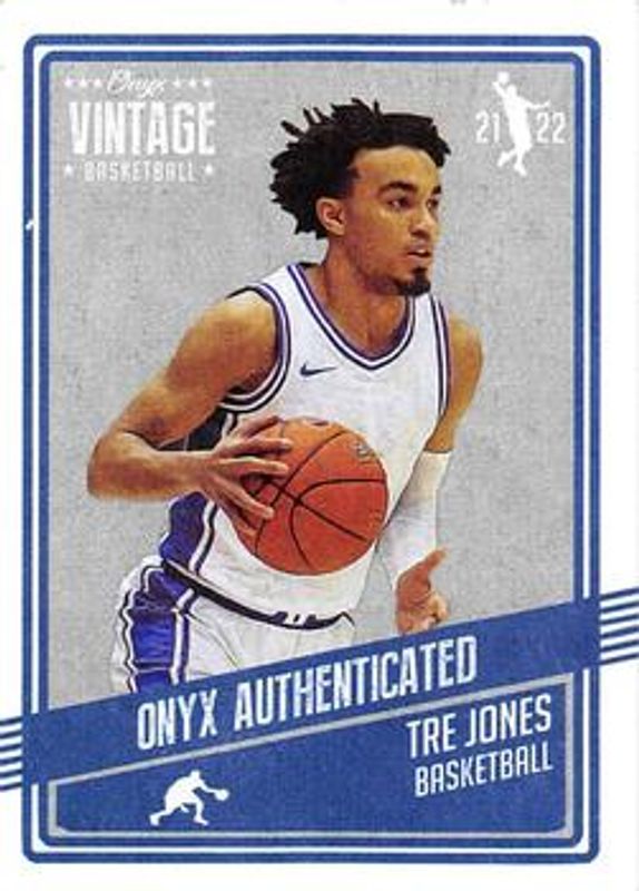 The Tre Jones 2021 Onyx Vintage #VBTJ Base card is 1 of 5 Tre Jones' card variations in the 2021 Onyx Vintage set being tracked by Sports Card Investor, including Black Signatures, Blue Signatures, Green Signatures, and Red Signatures.