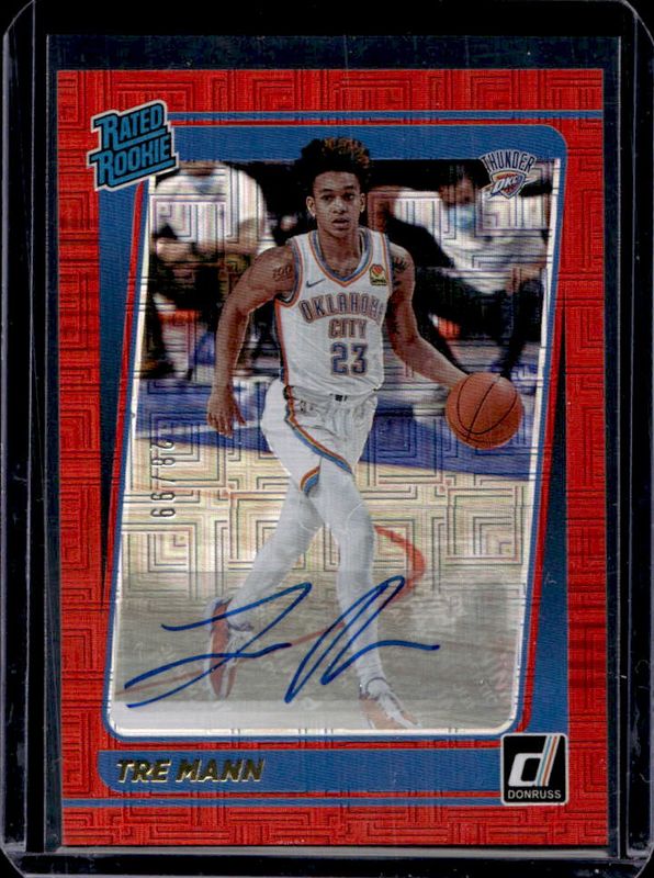 The Tre Mann 2021 Donruss #218 Rated Rookie Signatures - Choice Red /99 card is 1 of 61 Tre Mann's card variations in the 2021 Donruss set being tracked by Sports Card Investor, including Base, Choice, Green Ice, Green Laser, and Green & Yellow Laser.