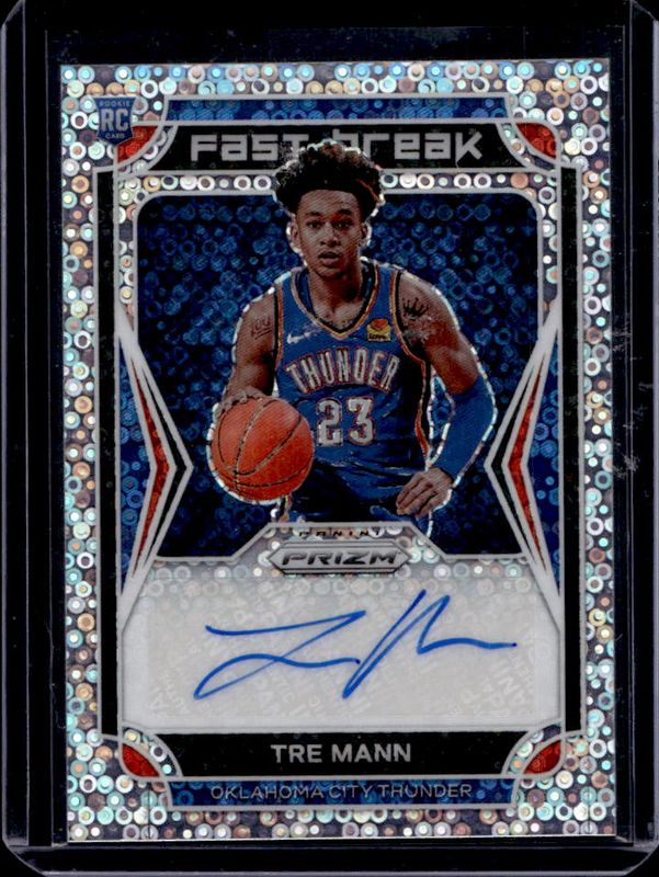 The Tre Mann 2021 Prizm #FBR-TRE Fast Break Rookie Autographs card is 1 of 96 Tre Mann's card variations in the 2021 Prizm set being tracked by Sports Card Investor, including Base, Blue NBA 75th Anniversary, Blue Wave, Choice Blue Yellow Green, and Factory Set Blue Hyper.