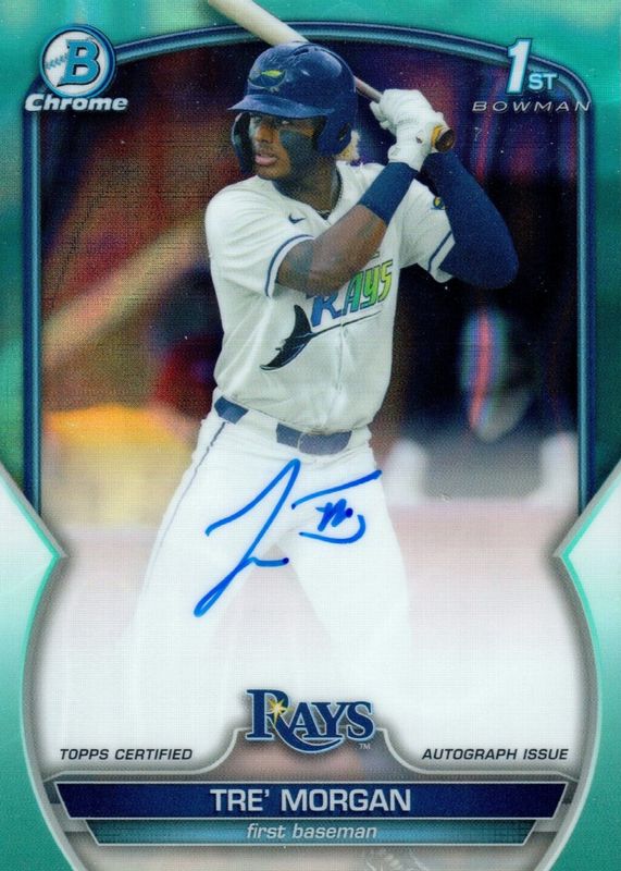 The Tre' Morgan 2023 Bowman Draft #CDA-TMO Chrome Prospect Auto - Aqua Lava Refractor /199 (1st) card in Raw condition has not changed in price in the last 30 days and was last sold for $58.00 .