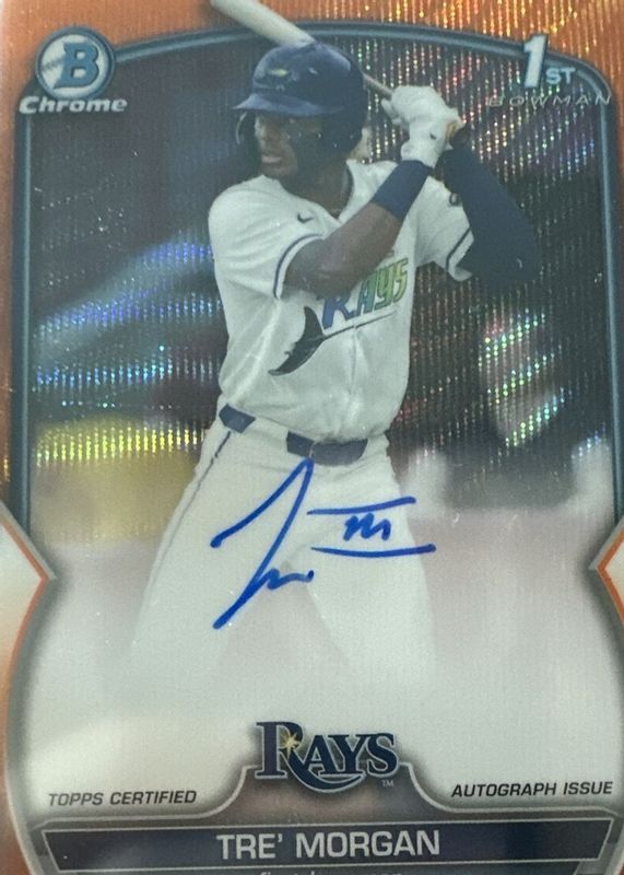 Auctions Ending Soon for Tre' Morgan 2023 Bowman Draft #CDA-TMO Chrome Prospect Auto - Orange Wave Refractor /25 (1st) RAW