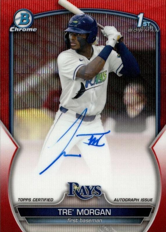 Auctions Ending Soon for Tre' Morgan 2023 Bowman Draft #CDA-TMO Chrome Prospect Auto - Red Wave Refractor /5 (1st) RAW