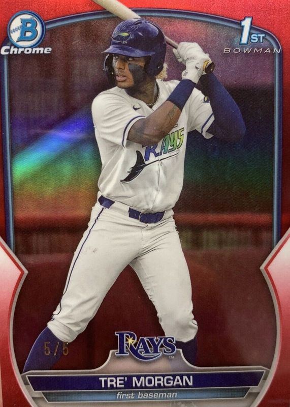 The Tre' Morgan 2023 Bowman Draft #BDC-199 Chrome - Red Refractor /5 (1st) card in Raw condition has not changed in price in the last 30 days and was last sold for $222.50 .