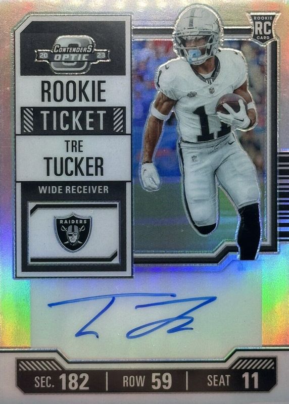 2023 CONTENDERS OPTIC Tre Tucker Rookie Ticket Silver Prizm Auto RC Raiders!