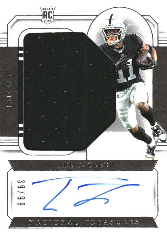 This card is 1 of 26 Tre Tucker's card variations in the 2023 National Treasures set being tracked by Sports Card Investor, including Rookie Material Signatures - Green Jersey Number (/11), Rookie Patch Auto - Green Jersey Number (/11), Rookie Patch Auto /99, Rookie Patch Auto - Purple /49, and Rookie Material Signatures - Holo Silver /25.