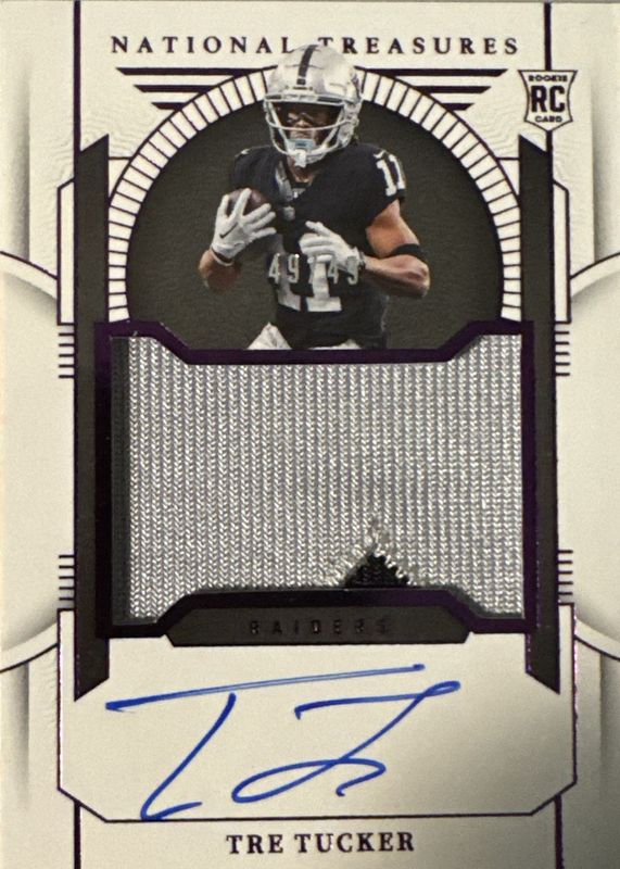 The Tre Tucker 2023 National Treasures #190 Rookie Patch Auto - Purple /49 card in Raw condition has not changed in price in the last 30 days and was last sold for $51.57 .
