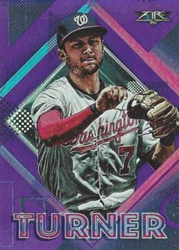 The Trea Turner 2020 Topps Fire #86 Purple /99 card is 1 of 15 Trea Turner's card variations in the 2020 Topps Fire set being tracked by Sports Card Investor, including Base, Blue Chip, Flame, Gold Minted, and Onyx.