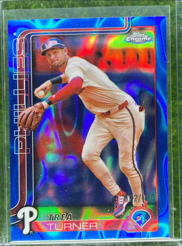 The Trea Turner 2025 Topps Chrome #208 Blue Lava Refractor /150 card is 1 of 72 Trea Turner's card variations in the 2025 Topps Chrome set being tracked by Sports Card Investor, including Base, Geometric Refractor, Image Variation, Lightboard Logo Variation, and Negative Refractor.