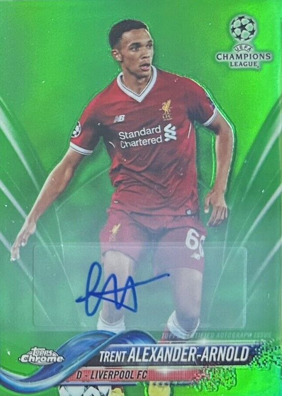 The Trent Alexander-Arnold 2017 Topps Chrome UEFA Champions League #29 Autographs - Green Refractor /99 Rookie card in Raw condition has not changed in price in the last 30 days and was last sold for $269.00 .