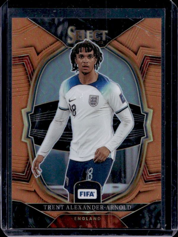 The Trent Alexander-Arnold 2022 Select FIFA #15 Orange /60 card is 1 of 19 Trent Alexander-Arnold's card variations in the 2022 Select FIFA set being tracked by Sports Card Investor, including Base, Blue, Checkerboard, Multi Color, and Peacock.