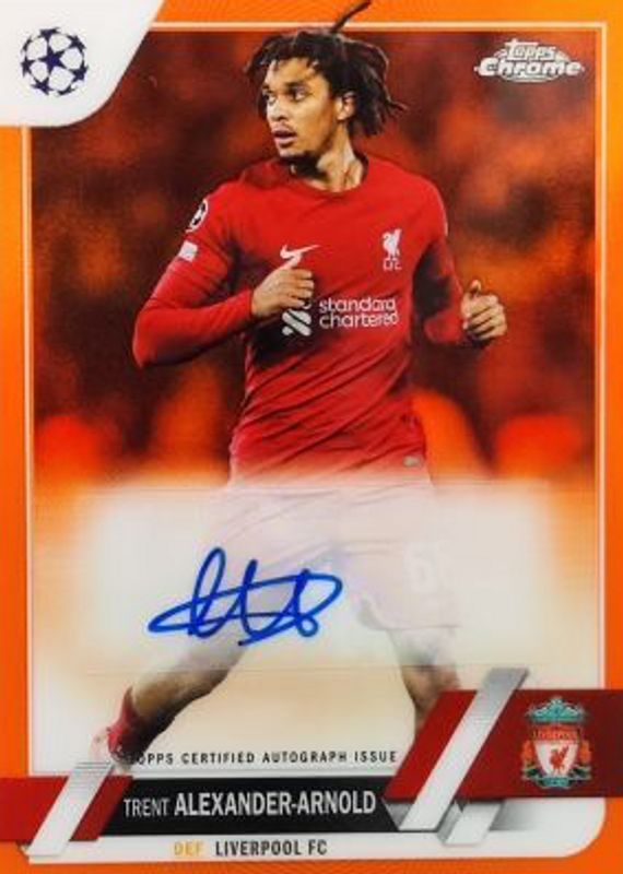 The Trent Alexander-Arnold 2022 Topps Chrome UEFA Club Competitions #CA-TA Autographs - Orange Refractor /25 card in Raw condition has not changed in price in the last 30 days and was last sold for $112.50 .