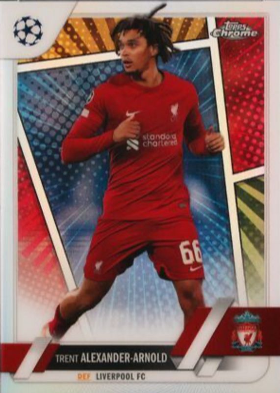 The Trent Alexander-Arnold 2022 Topps Chrome UEFA Club Competitions #66 Hero Variation /(SSP) card in Raw condition has not changed in price in the last 30 days and was last sold for $4.15 .